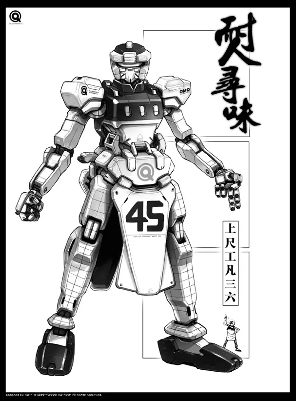 於是我用英文設計了比較現代未來感的LOGO,適配了機動化、機甲化的風格。為了致敬,保留了原人物的繪畫,作爲和機械人對比。還保留了老夫子中經常出現的一些文字。如”耐人尋味“、”怪譚“,中國古代樂譜”上尺工凡三六“,黑白、漫畫格等等。